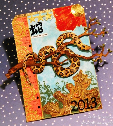 I made a few of these Asian themed postcards to swap out with a couple of people using Distress Stains to create a Marbled Background on the postcard itself. The snake was cut from Kraft Paper and embossed with Tim's Bubbles Texture Fade.