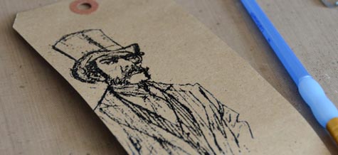 May wanted to figure out a way to create a really grungy kraft tag, but still have the gentleman stand out and not get washed out in all the mess.